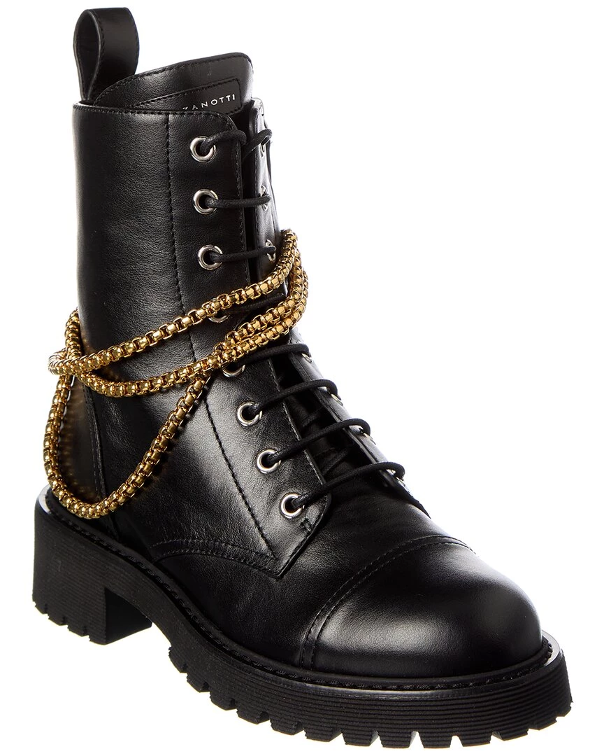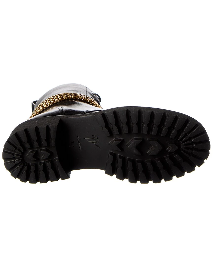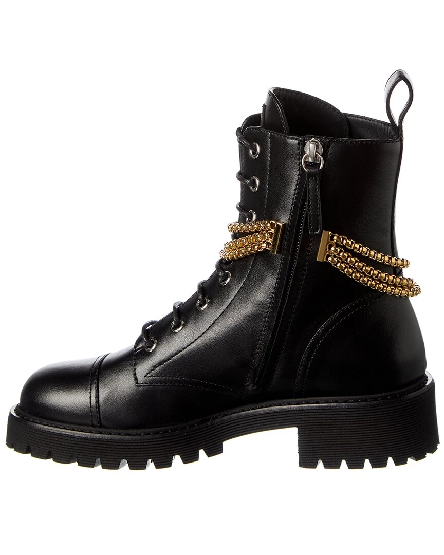 - 25 Leather Combat Boot In Black Leather And Gold-Tone And Silver-Tone Hardware With Chain Accent And Inner Side Zipper
