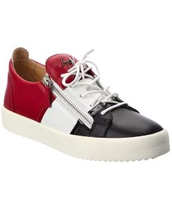 - May London Leather Sneaker In Red, White And Black Leather And Silver-Tone Hardware With Zipper Accents