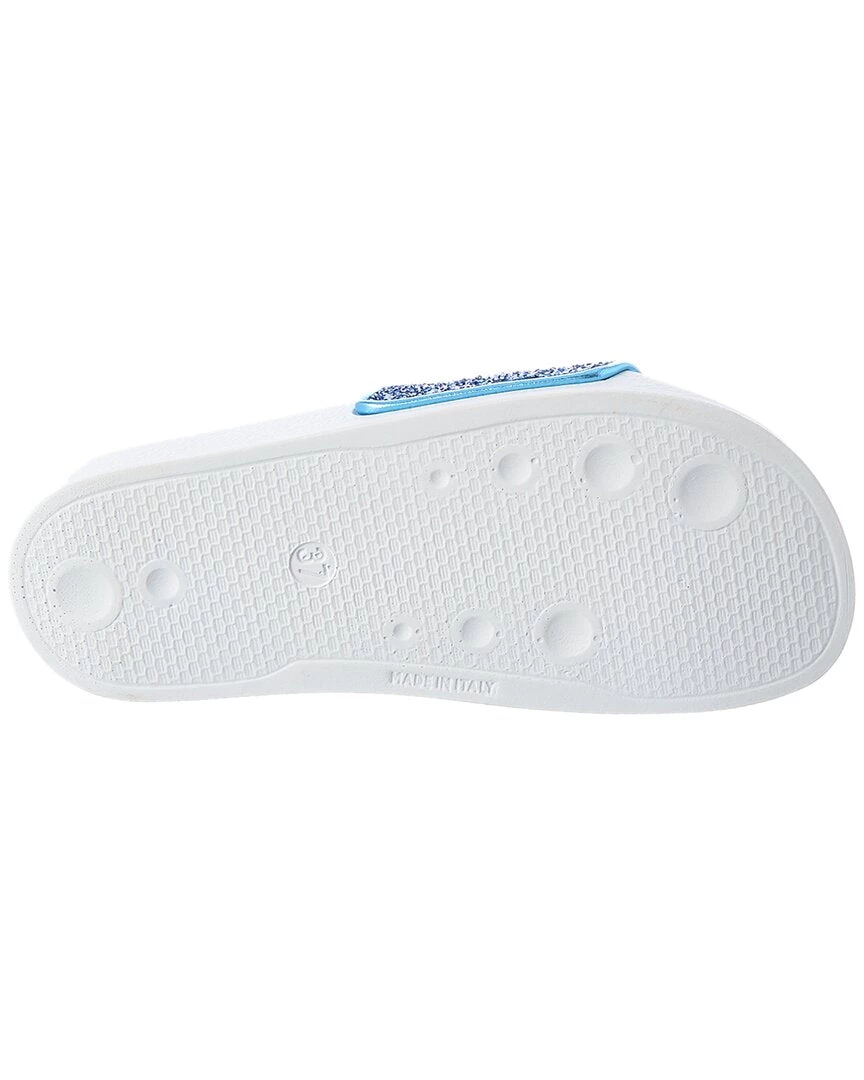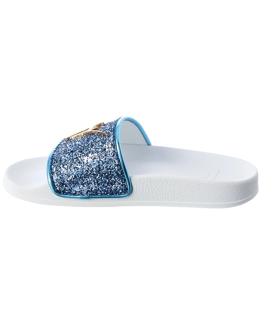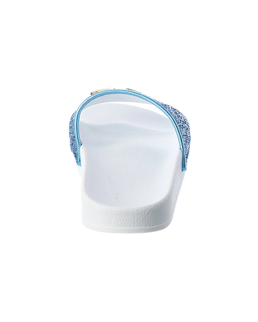 - Newlaburela Leather Slide In Metallic Blue Leather And Gold-Tone Hardware With Glitter Design And Logo Accent