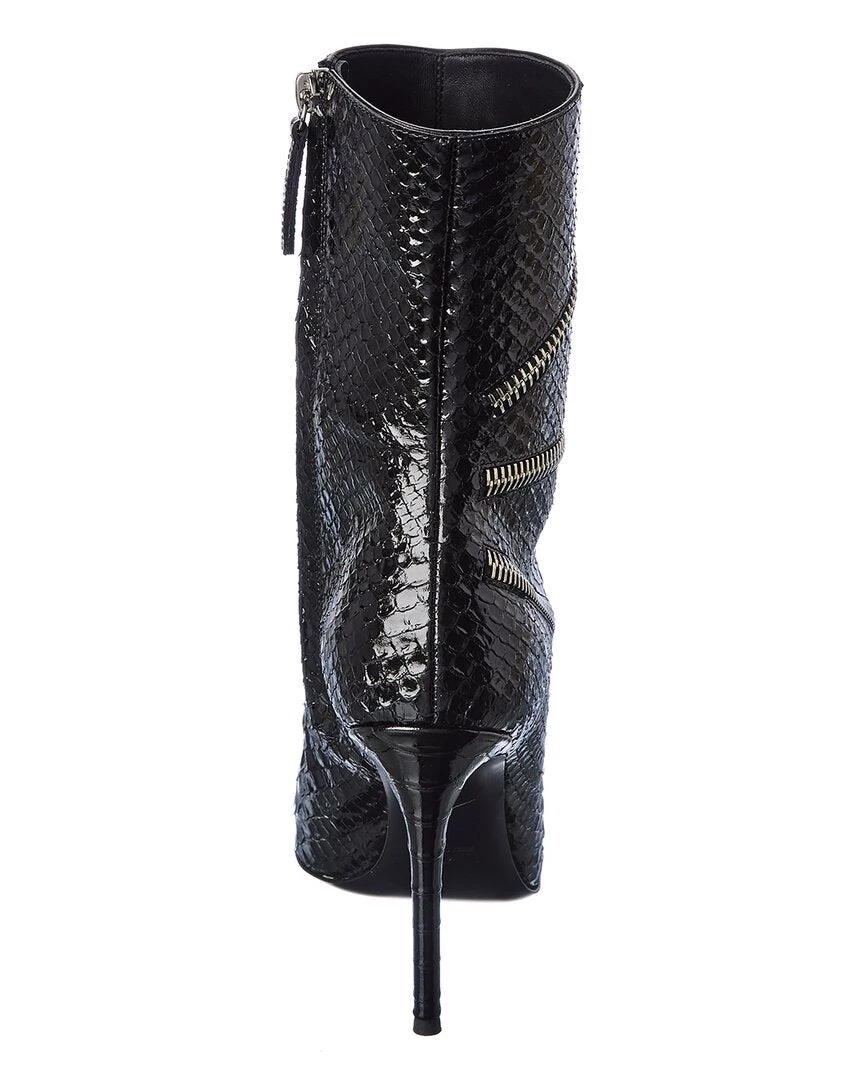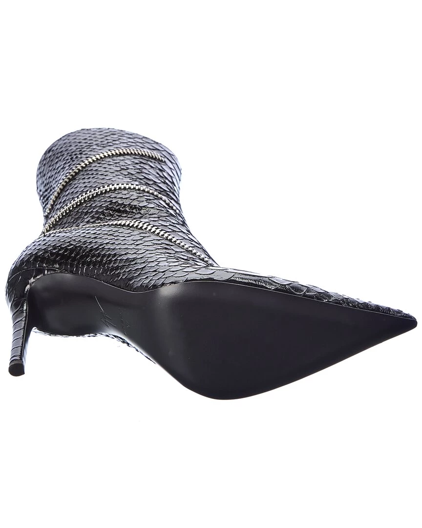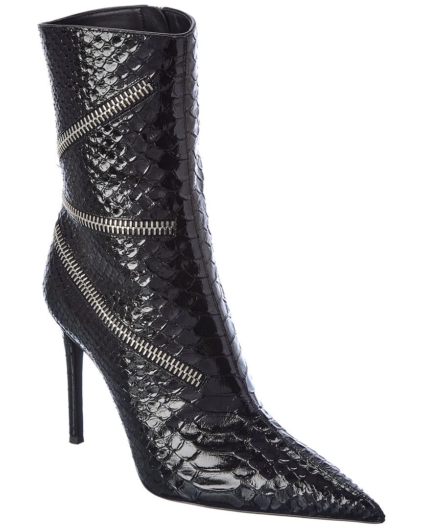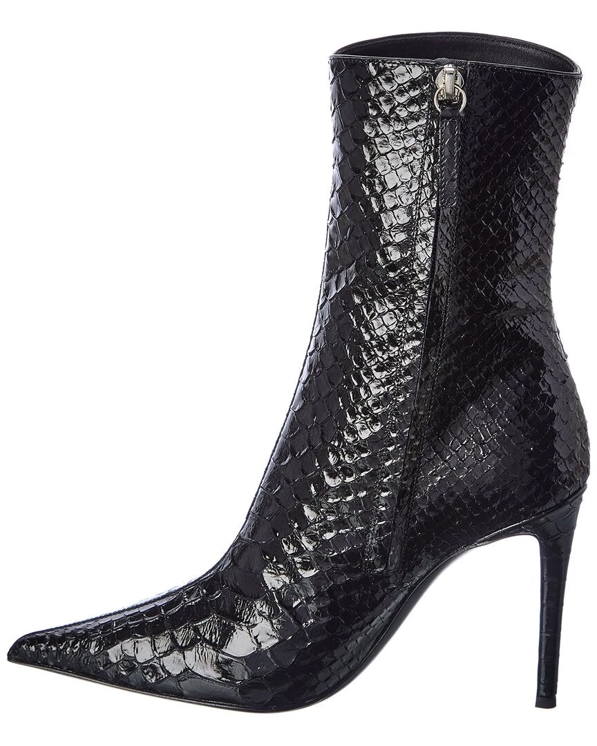 - Raquel 105 Snake-Embossed Leather Bootie In Black Snake-Embossed Leather And Silver-Tone Hardware With Zipper Trim And Pointy-Toe